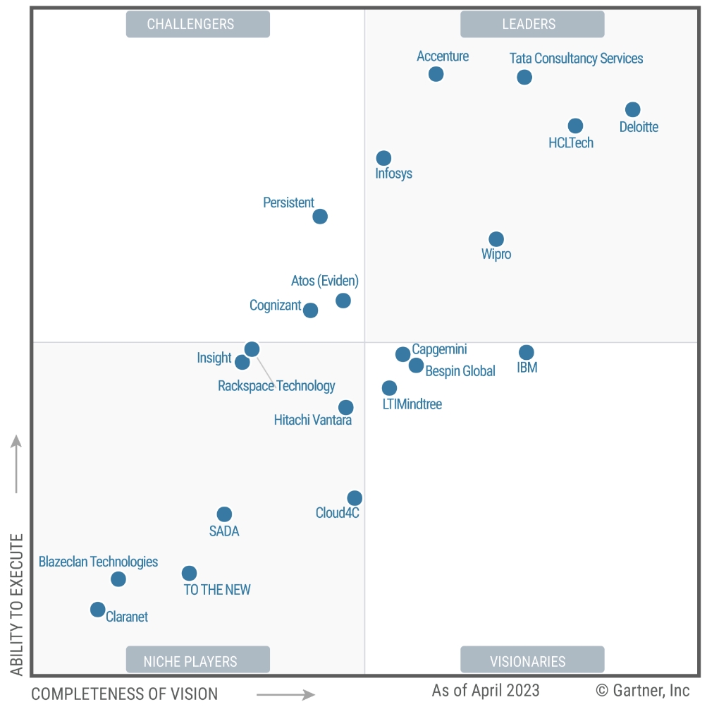 Wipro is positioned as a Leader in the 2023 Gartner® Magic Quadrant™ for Public Cloud IT Transformation Services which evaluates service providers on their Ability to Execute and Completeness of Vision.