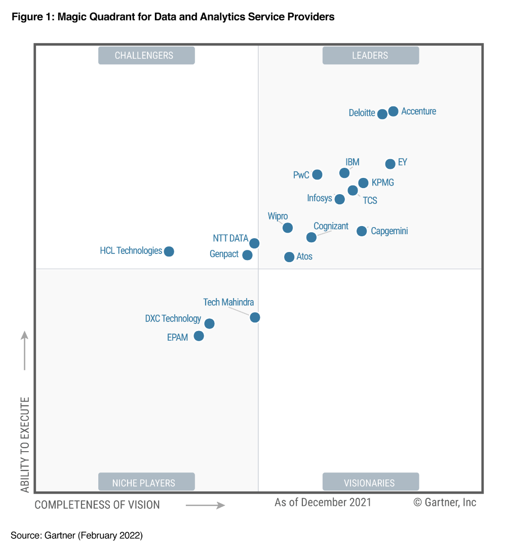 Gartner, a company that delivers actionable, objective insight to its executive and their teams, named Wipro a Leader in its February 2022 report titled, Magic Quadrant for Data and Analytics Service Providers. Wipro was recognized based on its Ability to Execute and Completeness of Vision.