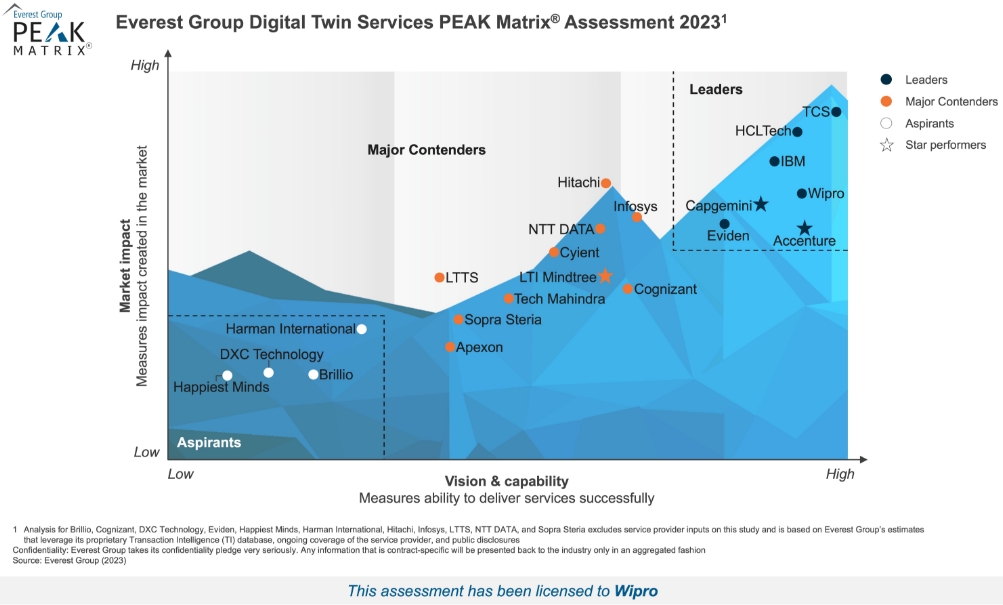 Everest Group has named Wipro a Leader in the Digital Twin Services PEAK Matrix® Assessment 2023. The Leader ranking is based on Everest Group’s evaluation of 21 digital twin service providers based on their: