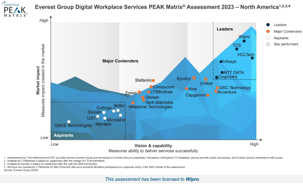 The 2023 Everest Group’s Digital Workplace Services PEAK Matrix® Assessment – North America assesses 26 digital workplace services providers on their vision, capabilities, and market impact. Wipro is proud to be named a Leader in this report.