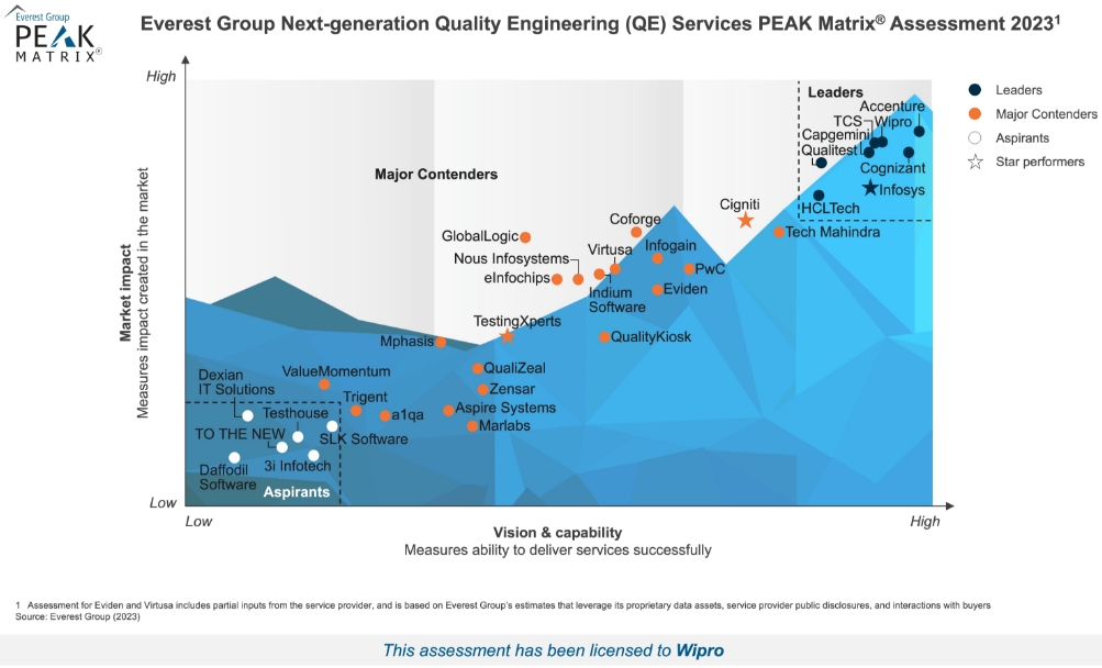 “As enterprises invest in next-generation technologies such as AI, big data, IoT, AR/VR, and blockchain to drive innovation in their business, the emphasis on engaging with next-generation quality engineering service providers has notably intensified. These providers are emerging as their quality-first partners to support them in building high-quality products with next-generation technologies and establish standardized quality engineering processes,” said Ankit Gupta, Practice Director, Everest Group. "Wipro emerges as a Leader in Everest Group's Next-generation Quality Engineering (QE) Services PEAK Matrix® Assessment 2023, owing to its comprehensive solution portfolio in the next-generation QE services space, which is further fortified by its continued investments in strengthening technology provider partnership network and next-generation-focused QE solutions such as Wipro Intelliassure, which is part of the broader Wipro ai360 initative. "
