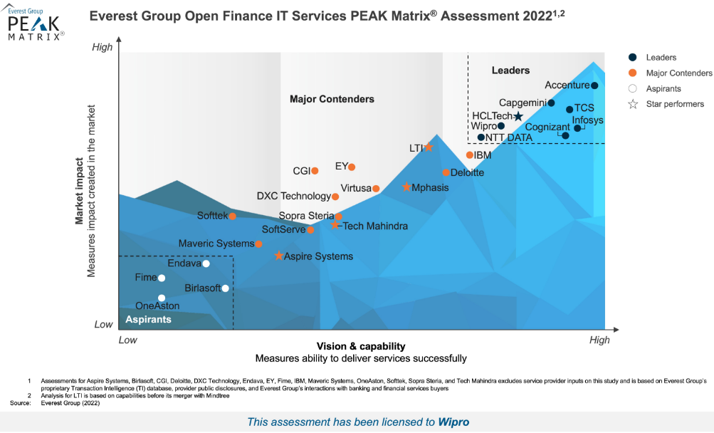 In their assessment, Everest Group noted Wipro’s ability to be a strategic partner and to provide clients with credible proof points that speak to the regulatory compliance issues and emerging technology challenges that can be targeted by an end-to-end open banking journey. They also noted the strength of Wipro’s API Marketplace (including API project management, integrators, low-code/no-code capabilities, and cloud-based deployment) and its 360-degree partnership with the Banking Industry Architecture Network (BIAN).