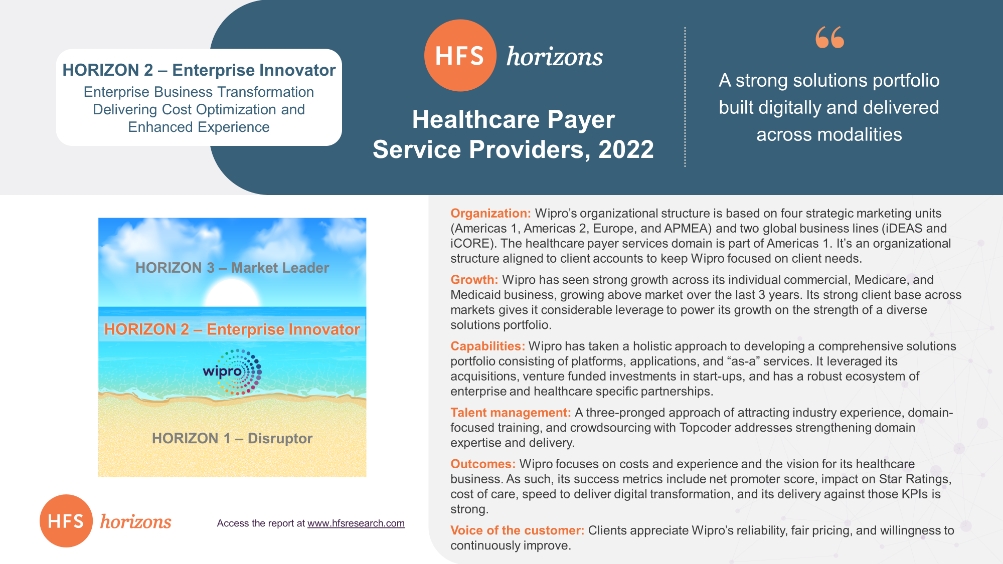 Global business research consultancy HFS named Wipro an Enterprise Innovator in its Horizons Healthcare Payer Service Providers 2022 report, citing Wipro’s “strong solutions portfolio built digitally and delivered across modalities.”