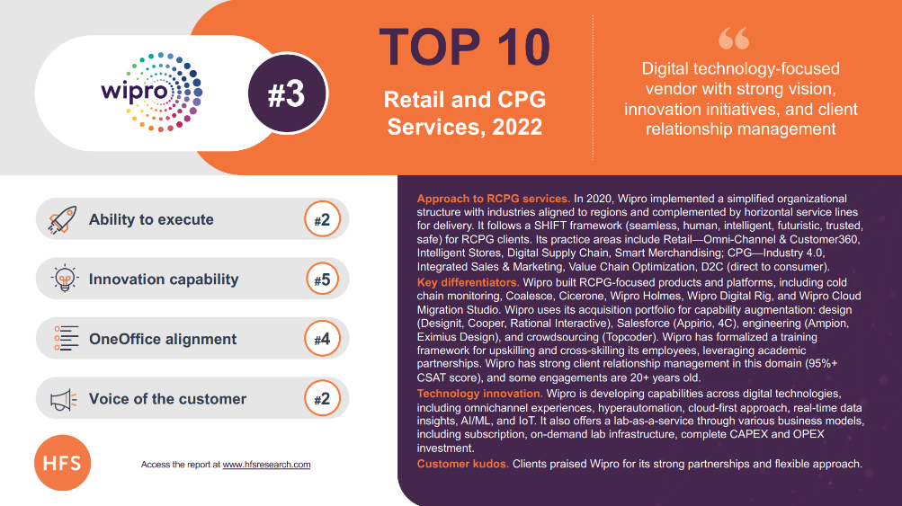 HFS Top 10: Retail and CPG Services, 2022 ranks Wipro third in its list of top ten retail and CPG service providers.