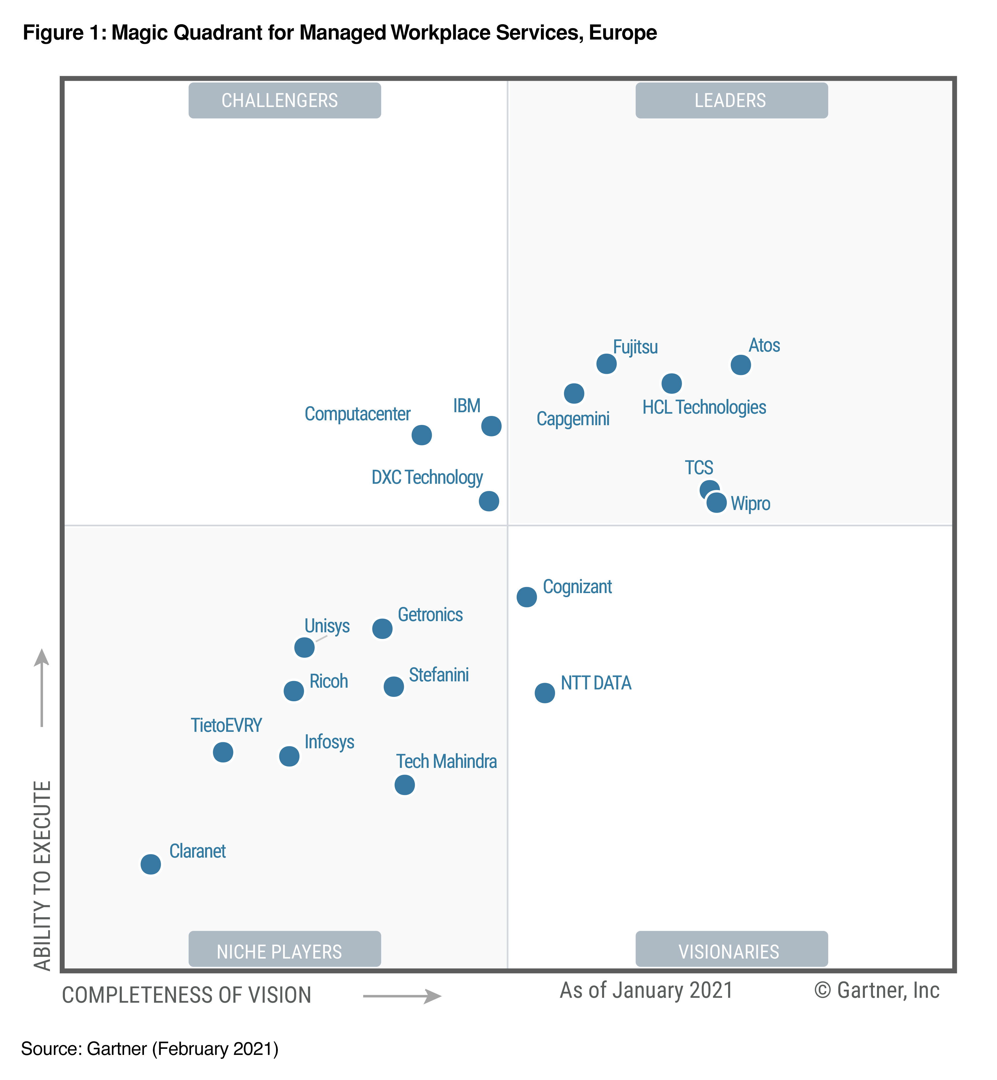 Disclaimer: Gartner, Magic Quadrant for Managed Workplace Services, Europe, David Groombridge, Claudio Da Rold, Alexandra Chavez, Daniel Barros, Katja Ruud, 24 February 2021