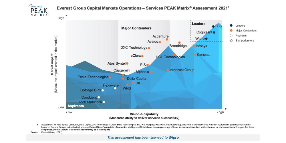 The Everest Group assessed detailed profiles of 24 leading service providers featured on the Capital Markets Operations - Services PEAK Matrix® 2021 based on absolute market success, and overall capability and categorized them into Aspirants, Major Contenders, and Leaders.