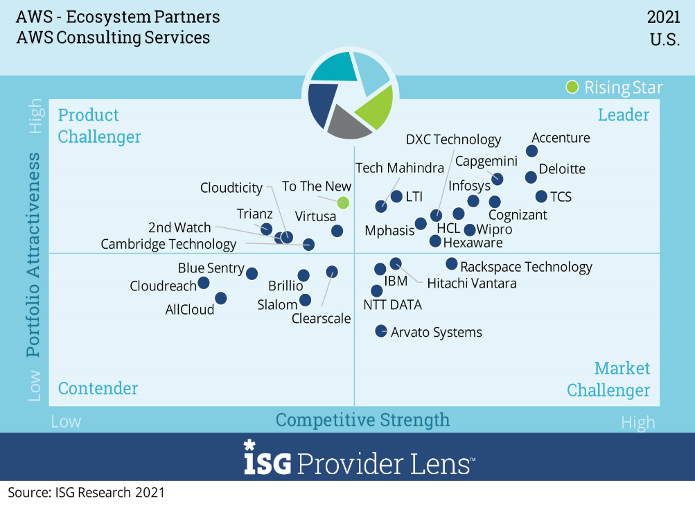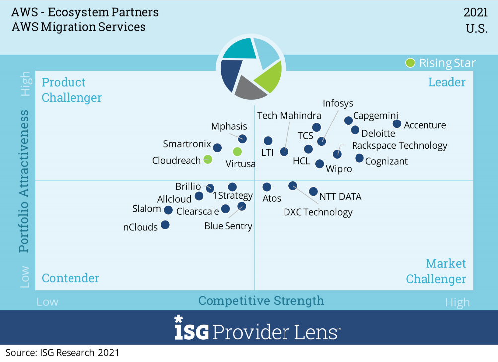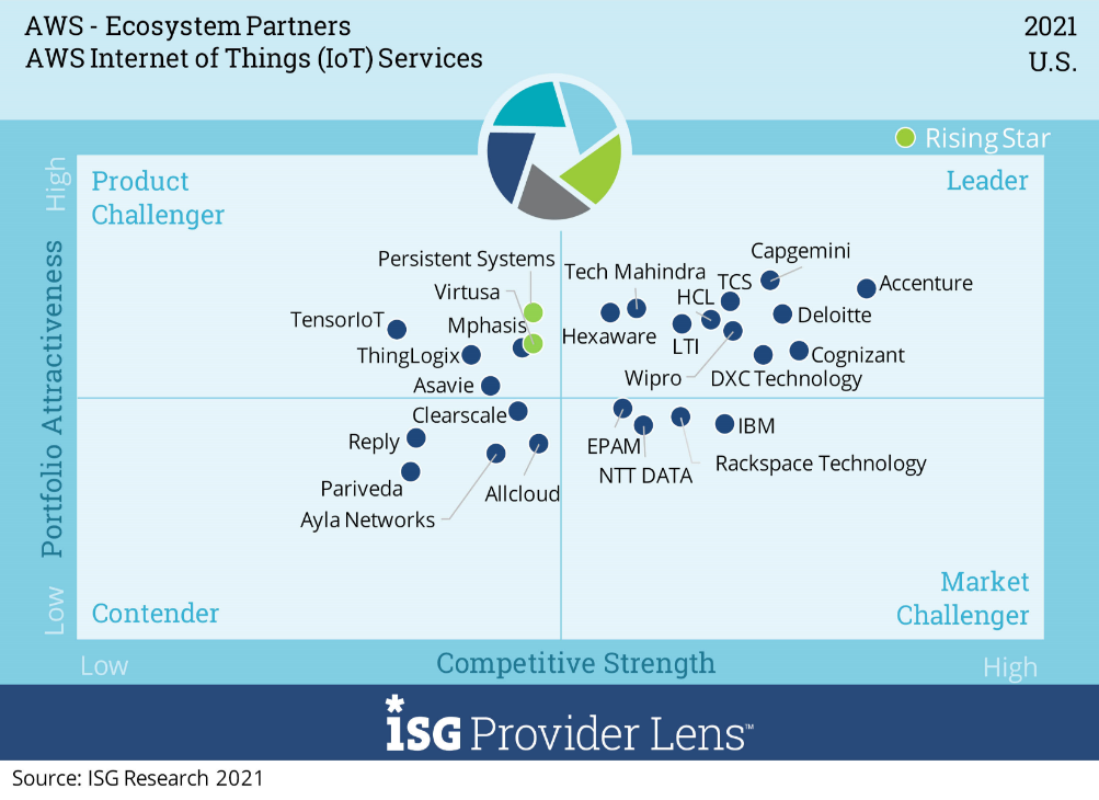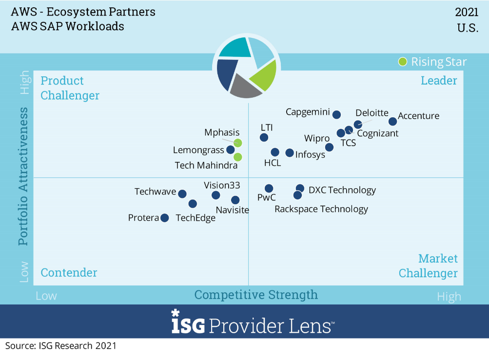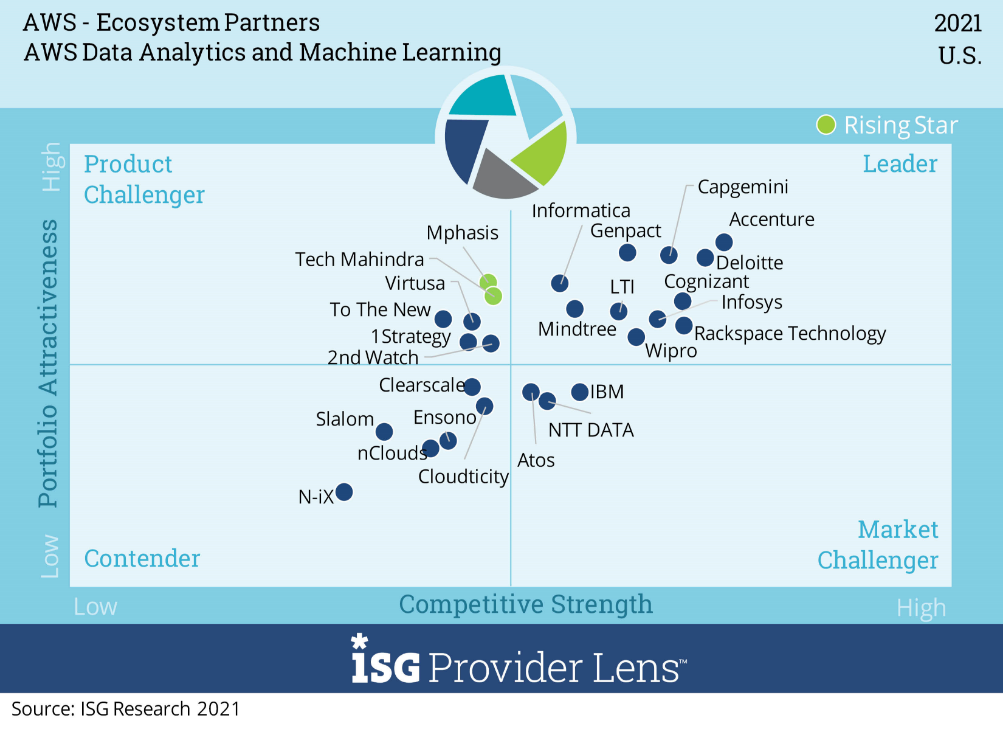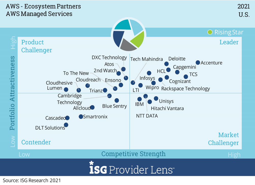 ISG evaluated multiple service providers for its “AWS – Ecosystems Partners” ISG Provider LensTM report, comparing provider strengths, challenges and competitive differentiators across 6 quadrants for the US market: AWS Managed Services, AWS SAP Workloads, AWS Data Analytics and Machine Learning, AWS Internet of Things (IoT) Services, AWS Migrations Services and AWS Consulting Services.