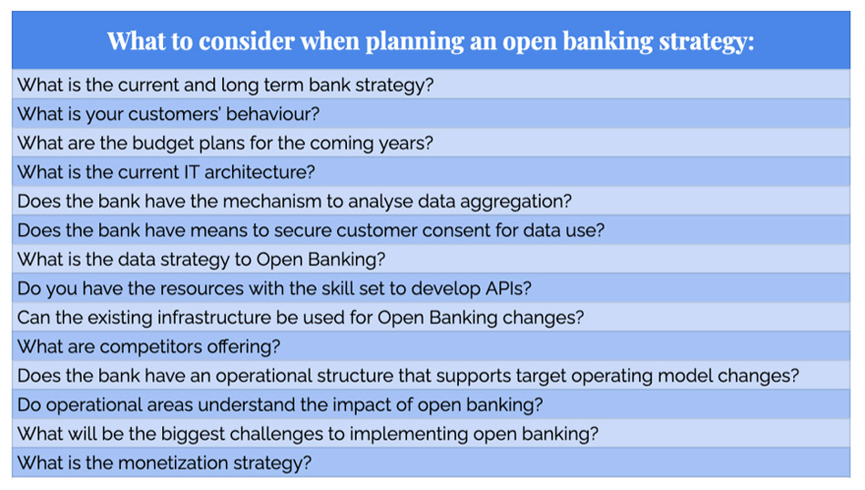 As a first step, banks should strategize their overall objectives and decide on the avenues where open banking can fit their model. Some of the pertinent questions that will help banks build a strategy are included in the table below. Don’t just blindly adopt open banking. Think about how it fits into a bigger strategy to provide better customer experiences, extend reach and strengthen the brand, whether you build it or partner with FinTech to expand your offerings.