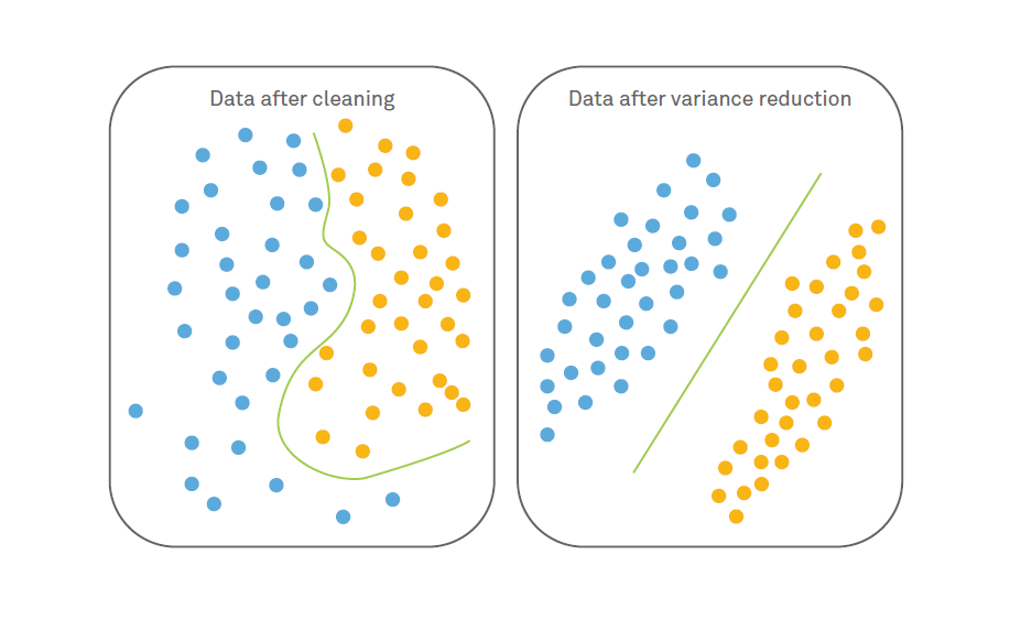 For example, in Figure 2 the chart on the left represents data after it is cleaned while the chart on the right represents data after variance reduction. It is clear that after variance reduction, the ML model results are much more accurate.