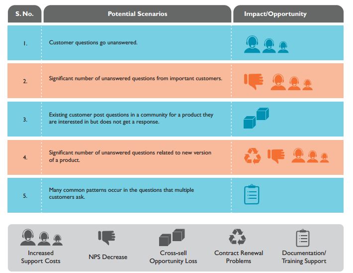 Enterprises that do not respond promptly to customer queries and problems face several risks. When a customer problem goes unanswered, it increases the cost of support (See Figure 2: Business Impact of Unsupported Customers). The customer is forced to use a customer care centre. This means footing support centre costs. When the number of unanswered questions from customers continues to pile up, not only does the cost of support go up but it also reduces Net Promoter Score (NPS)1. NPS is an indicator of how likely a company or person is to recommend an enterprise’s product or service to others. The biggest and simplest opportunity missed in the absence of a healthy community is the ability to cross-sell and up-sell: Existing customers may post questions with regard to a product they are interested in, but they don’t get a response. This often happens when an enterprise does not formally list “online community” as a potential sales channel and give it the attention it deserves. When a large number of questions across users remain unanswered, it could spell big trouble. The cost of support goes up, NPS scores fall and there may even be potential contract renewal challenges. The questions and problems posed to an online community offer tremendous product and service insights. They may signal opportunities to re-assess and upgrade product or service documentation and training enhancements. In each of the above cases, analytics plays a crucial role. By deploying analytics, enterprises can discern community signals for beneficial action.