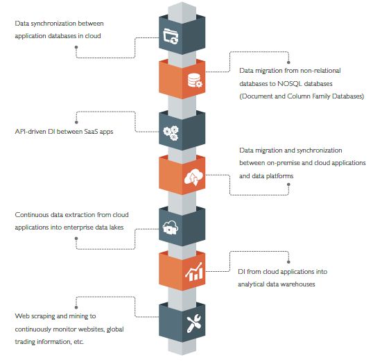 These capabilities are addressed via newer technology platforms such as Integration Platform as a Service (IPaaS) that provides for better leverage the operational expenses model and reduce TCO. Additionally, some EDW workloads (i.e. investigative analytics) are also migrating to cloud through provisioning of analytical databases like HP Vertica and Amazon Redshift. This demands a new set of cloud DI patterns such as the foundational platform to integrate not just on-premise and cloud but also Core and Edge applications in the enterprise. Technology vendors like Snap Logic, Informatica, Actian, Kapow and Jitter Bit enable these new capabilities.