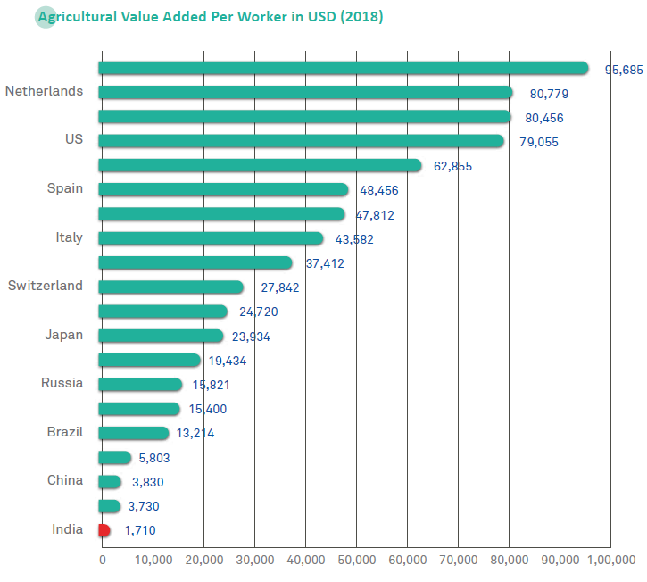 While these numbers may seem impressive on an absolute basis, they fail to promise if we delve a little deeper. Although this sector employs(directly/indirectly) about 58% of the population, it contributes only about 15.87% to the country’sGDP2. This brings us to a key parameter, that is, agricultural productivity. The most popular metric to measure agricultural productivity is agricultural Value Added per Worker. A comparison of the top 20 economies on this metric reveals that India’s agricultural productivity has great scope of improvement(Illustrated in Figure 1).