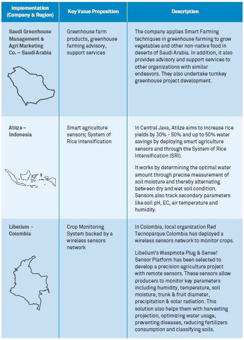 There have been several initiatives across the globe in the implementation of Smart Farming Powered by Analytics. Some of the solutions and their implementation details are listed in Table 1 .