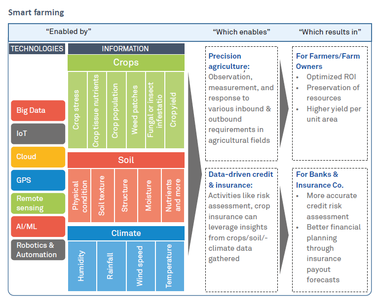 Given the wealth of data that the on-field sensors provide, when demand-related data is added to it,it can help reveal more insights, which are relevant for the marketing function. This data is also relevant for inbound logistics (supply, procurement as well as storage of seeds, fertilizers, manure, etc.) as well as outbound logistics (distribution to the market). Basically, it helps enable decisions on when to store and when to sell. Last but not the least, the plethora of production, climate, crop health, and demand data and insights can help financial institutions and insurance companies gauge risks better to come up with better propositions for farmers.