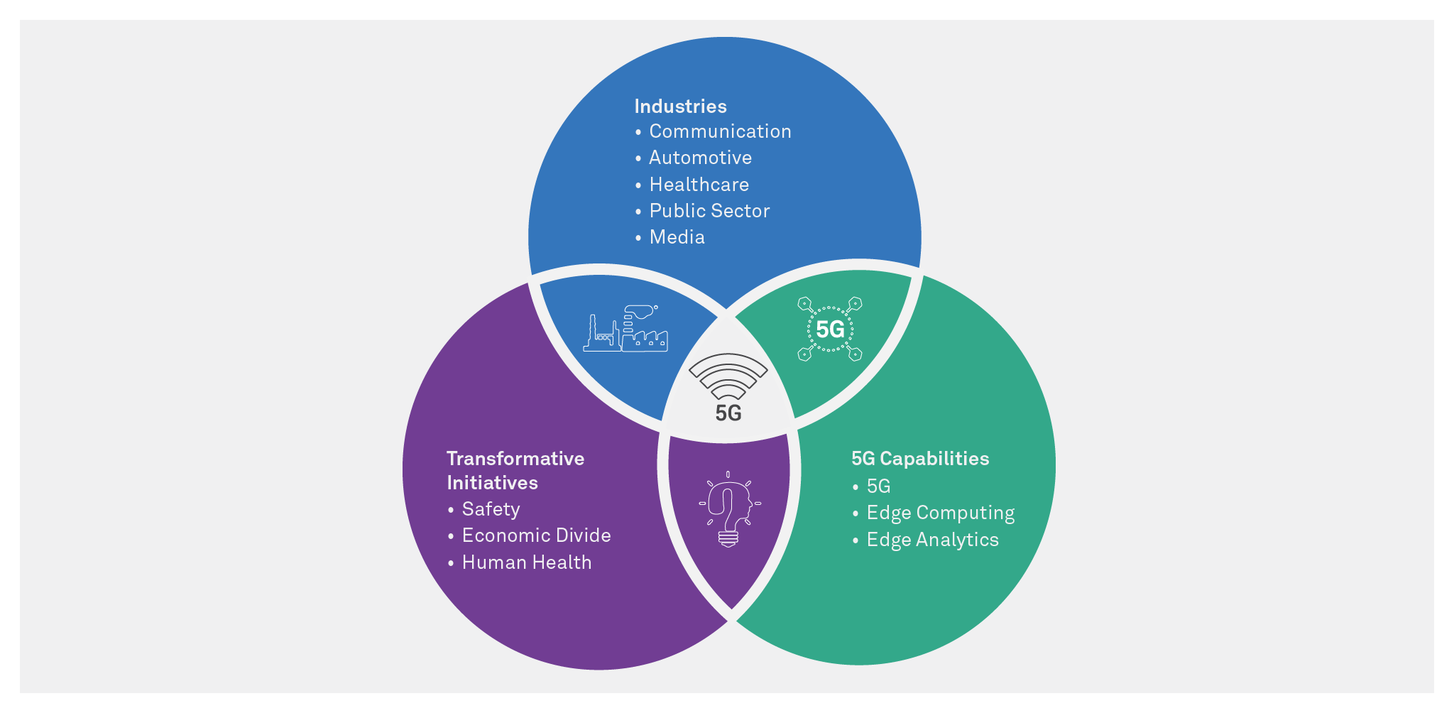 Figure 1: At the intersection of industries, transformative initiatives and 5G capabilities lies the true transformative potential of Edge Analytics