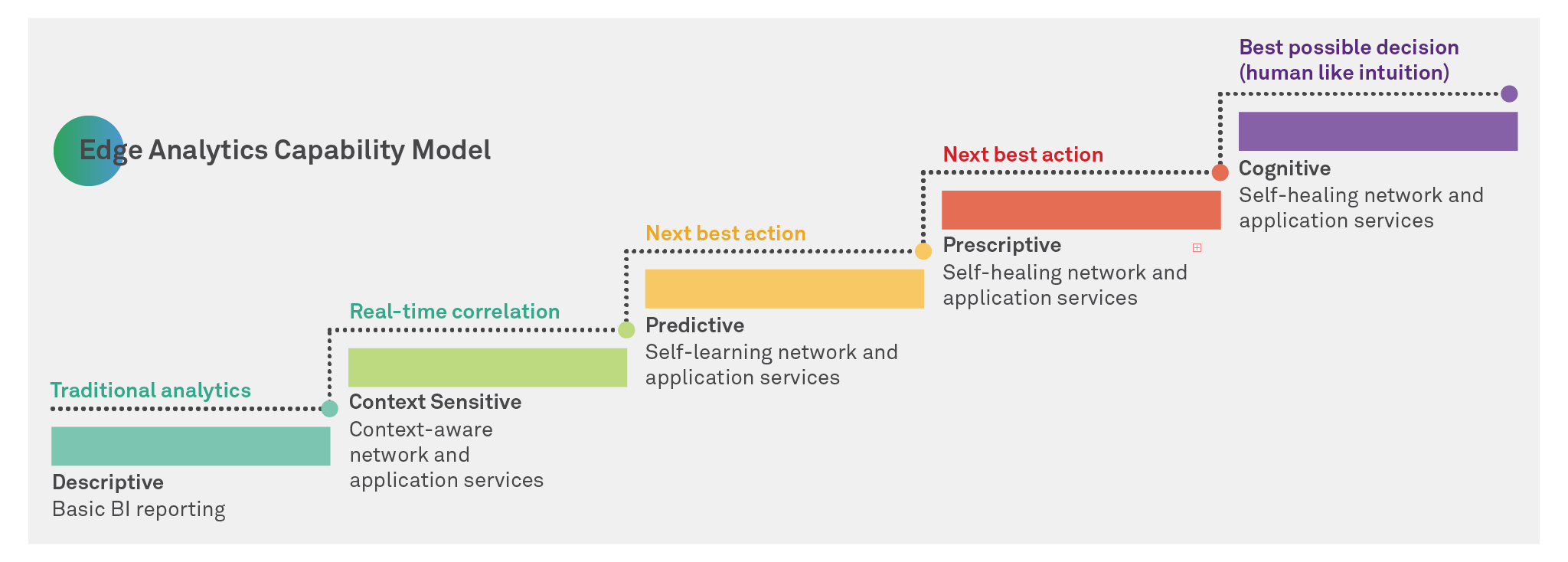 Edge analytics in 5G will not be restricted to traditional descriptive analytics and basic BI reports but will evolve to an extent that it will learn from the context, predict what will happen next, prescribe the next best action or decision, and learn from the past behavioural patterns for taking the most optimal decision. For fully autonomous applications, edge analytics will automate the next action in real-time. With the speed of 5G, more information will be collected and processed, and edge analytics generated insights will increasingly drive decision-making, leading to cognitive intelligence applications (See Figure 2).