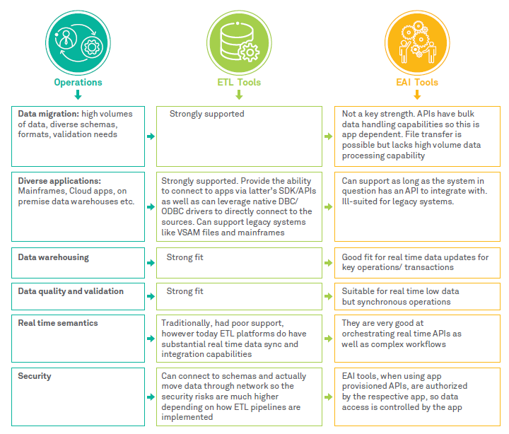 Applications started talking to each, mostly driven by the usage requirement—either asynchronously via messaging or synchronously via HTTP and other online protocols. The availability of bandwidth and processing power constrained them to use minimum amount of data for processing. The predecessors of current day web APIs trace their root in this type of Enterprise Application Integration strategy. Figure 1 gives the relative advantages of each strategy - ETL vs EAI.