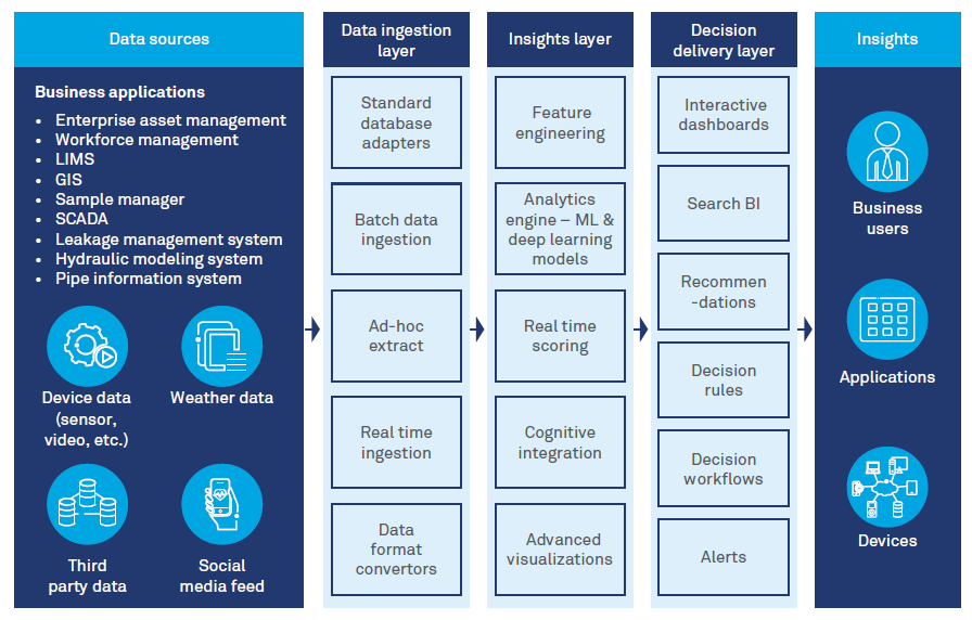 A predictive system/insights tool, specifically built for water utilities, will allow utilities to stay one turn ahead of issues at each stage of clean and waste water supply, distribution and management. The tool will use data leveraged using extraction and analytical processes, algorithms, models and best practices that are specific to water utilities. The insights, decisions and recommendations will be provided to business users and applications across a variety of devices. (See Figure 1 for the reference architecture of the insights tool)