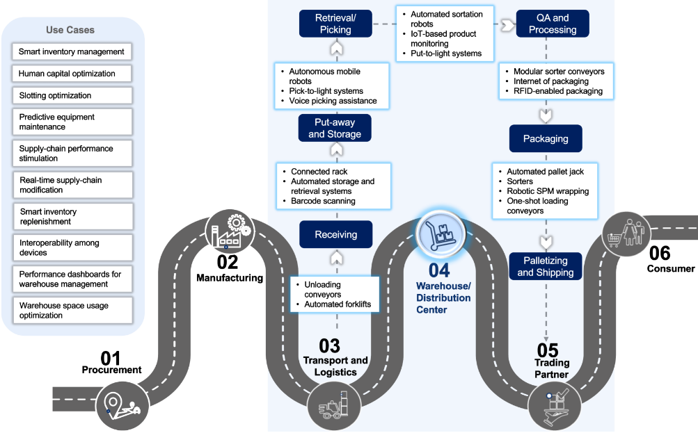 In an edge-based intelligent warehouse management process for CPGs, which have limited shelf-life and are intended to be used quickly, a significant amount of data is generated. Stakeholders then analyze the data to derive valuable insights, resulting in effective real-time inventory monitoring and decision-making. For instance, cosmetics typically deteriorate if exposed to extreme temperature fluctuations and thus require temperature-controlled environments from production to consumption. A warehouse’s IoT temperature sensors can measure humidity, temperature, and light levels to ensure the data points do not exceed the defined threshold. With edge-driven continuous monitoring and reporting of these conditions, quality products can be shipped, compliance can be met, and unexpected expenses can be avoided.
