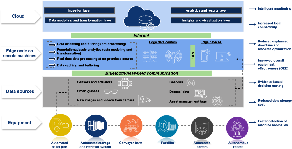 In addition to enhancing inventory monitoring, adopting IoT and edge-based analytics can transform how organizations manage equipment maintenance. The performance of predictive analytics models locally optimizes and enhances the speed and performance of predictive equipment maintenance. The implementation of predictive analytics solutions not only attenuates data storage costs, but also facilitates real-time updates. Various machines and equipment connected to sensors, actuators, beacons, and cameras produce a huge amount of operational data, as shown in Figure 2. Analytics and computational capabilities integrated into these devices can analyze the collected data at the edge layer, providing real-time insights that enable operators to make informed and prompt decisions.