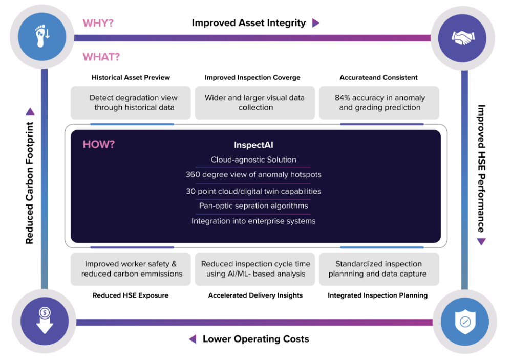 InspectAI empowers businesses to inspect their assets comprehensively and frequently, and create historical data. Based on an asset’s condition and InspectAI’s anomaly prediction, real-time alerts can trigger the asset maintenance workflow proactively. By moving from a reactive to a predictive maintenance approach, enterprises can increase asset integrity and improve workplace environments to support worker health and safety.
