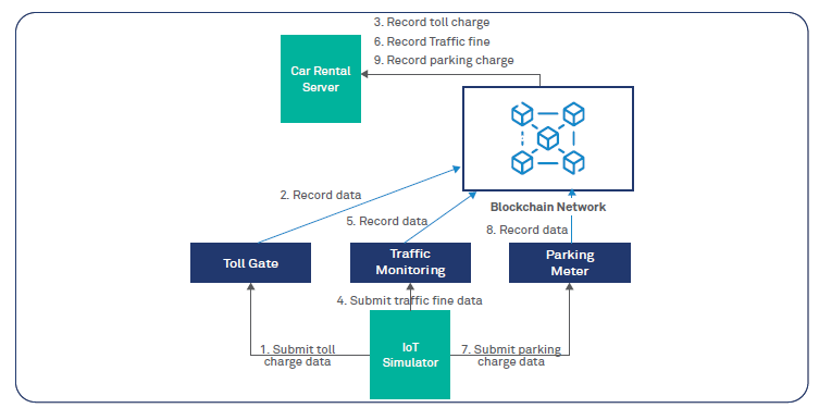 The data picked up by the sensors is relayed via an IoT gateway and processing system (see Figure 1) managed by a consortium of government and private agencies comprising road traffic authorities, toll road operators, parking providers, insurers, etc., (see Figure 2). The car rental agency, which is a part of the consortium, can relay information related to fines and charges for its fleet of cars to a Blockchain network by filtering the data.