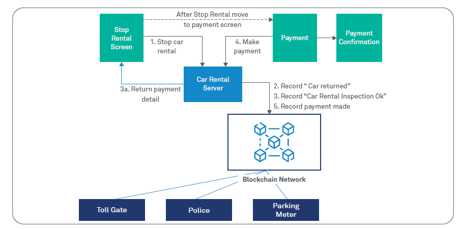 While the rental is in progress, the RFID tag on the car enables the traffic monitoring system to detect over-speeding; parking meters to capture the duration for which the car was parked; tollgates to record entry and exit points and compute applicable toll charges. This information is relayed to the Blockchain network in real-time.