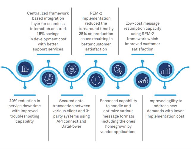 Wipro built a hybrid integration environment using IBM Integration Bus (IIB), WebSphere Message Queue, WebSphere DataPower, and API Connect to enable client’s middleware for digital transformation