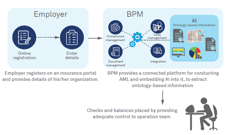 The AML process checks the identity of individuals and organizations carrying out financial transactions. It screens them against various global watch lists. The AML process also has to be used across national and regional jurisdictions. This makes AML complex, time consuming and expensive. Failures in AML processes leads to hefty regulatory penalties. For a leading insurance provider that was providing the workplace pension scheme to employers, the status quo was not maintainable. More importantly, it did not snag every suspicious business entity. A solution had to be found – and it was Artificial Intelligence (AI) with their existing BPM platform that came to the rescue.