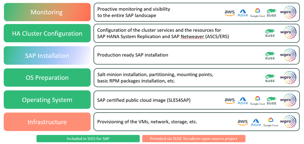 SUSE is partnering with Wipro to provide a SUSE-Wipro Automation and Monitoring Framework for SAP deployments on the hyperscalers – Microsoft Azure, Amazon Web Services, and Google Cloud Platform. The framework combines SUSE's expertise in SAP, high availability, and automation, with Wipro's expertise in SAP S/4HANA implementation and migration to simplify, modernize, and accelerate business transformation for enterprises.