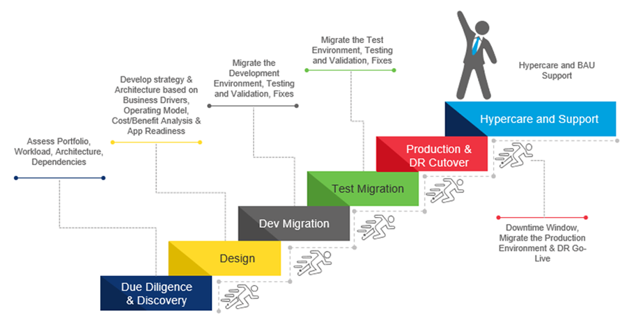 5. Production, DR Cut-Over: There should be enough time allocated for production and DR build environments to ensure all the learnings and best practices are implemented. Include enough time to perform validation and quality checks as well. It is highly recommended to implement a freeze period at least two weeks prior to production cut-over, ensuring no major changes are implemented that could lead to new, undocumented issues. If possible, perform a mock run and DR rehearsal prior to cut-over. This investment pays off by building confidence and ensuring a smooth production migration. During the cut-over, rigorously follow the migration plan an communicate status changes to all stakeholders. Most importantly, check readiness with the rollback mitigation plan in case it’s needed.