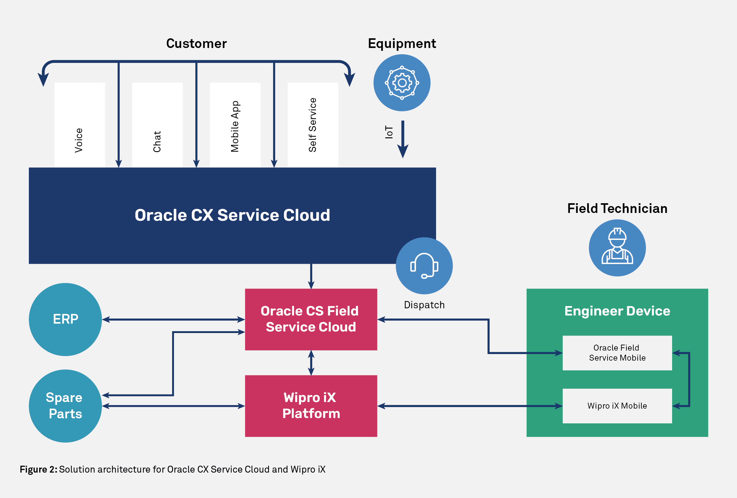 Wipro’s iX platform further adds to the robustness of Oracle CX Service Cloud. The combined power of these two platforms is a compelling answer for next-generation field service management. Figure 2 depicts the solution architecture for Oracle CX Service Cloud and Wipro iX.