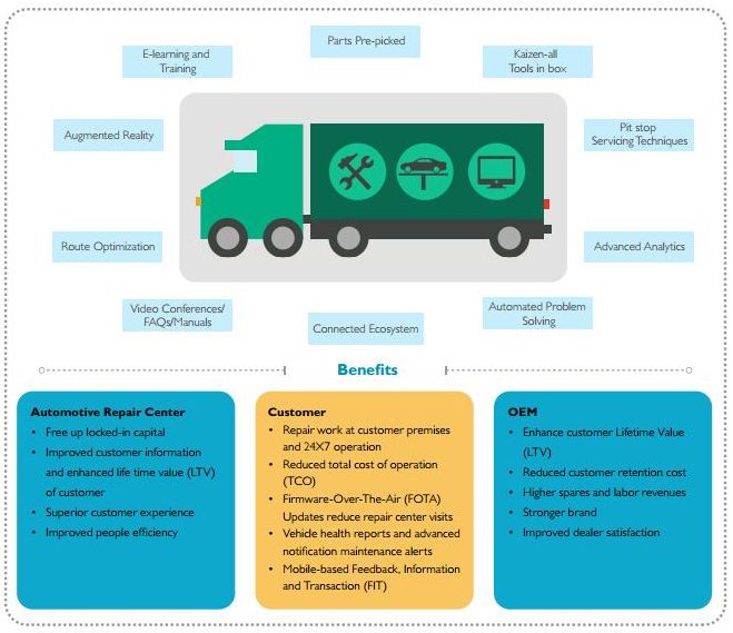 Most of the automotive repairs do not require large infrastructure and can actually be accomplished at customer premises. Figure 1 illustrates the key aspects of this.