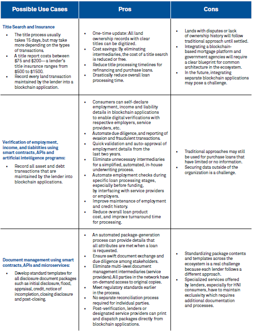 The mortgage industry is a major financial sector worldwide. Blockchain technology has enormous potential to transform the entire mortgage value chain, delivering unprecedented customer experience and empowerment, driving cost efficiencies, and achieving process excellence. This transformation is realistic, but it may take years to develop a mature model. Enterprises that adopt the blockchain platform as early as possible will reap economic advantages and can retain considerable market share. Blockchain technology is not meant to remove traditional lenders, but rather support the industry value chain by improving the experience for lenders and customers.