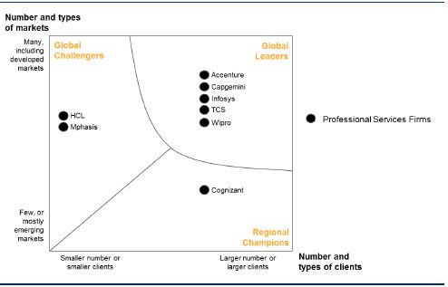 1. Global Leaders — companies with a large and established presence on a global scale, serving a broad range of clients. Most of them continue to grow, but they also have to increasingly fight off competition not only from other global players, but also from global challengers and regional champions.