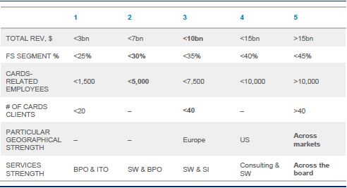 We recognise five professional services firms as global leaders: Accenture, Capgemini, Infosys, TCS, and Wipro, all of which have large and strong cards and payments practices and serve many clients around the world. While still substantial, the cards practices at HCL and Mphasis are relatively smaller; this is why those two firms are our global challengers. Both of those firms have substantial cards operations practices and are seen as key competitors in that area by other companies.