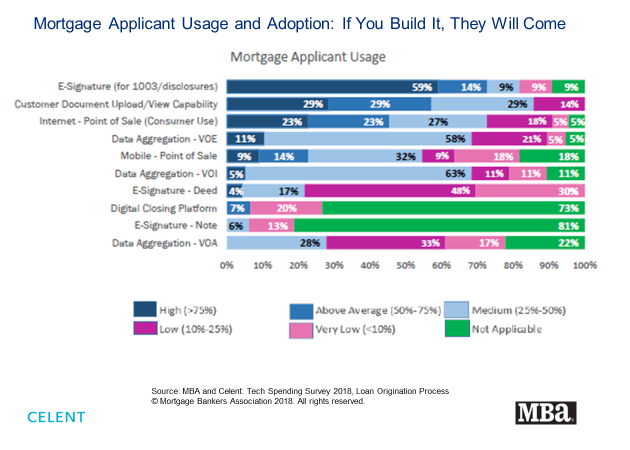 So this is what customers say they want, but if you build it, will they use it? the answer is yes. The 2018 MBA/Celent Technology Spending Survey 2018, Loan Origination Process, reveals that lenders are making the necessary IT investments to make that better. Exhibit 1 below summarizes responses from mortgage lenders about their customer’s adoption of consumer-direct technologies made available to them. This chart shows the percent of lenders that estimated technology adoption by their customers for the lending processes listed below. Estimates were segmented into five levels of technology adoption.