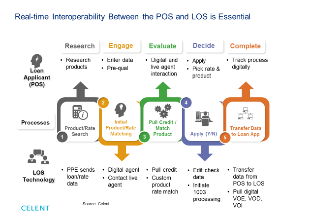 Digital customer engagement relies on live loan product and pricing data that the LOS or product/pricing engine (PPE) sends to the POS. Digital channel self-service point-of-sale (POS) technologies need to not only have research, engagement, evaluation and loan application capabilities, they need to integrate and exchange data with the core LOS, decisioning engine, and pricing engine during and after the prospect selects a loan and submits a loan application.
