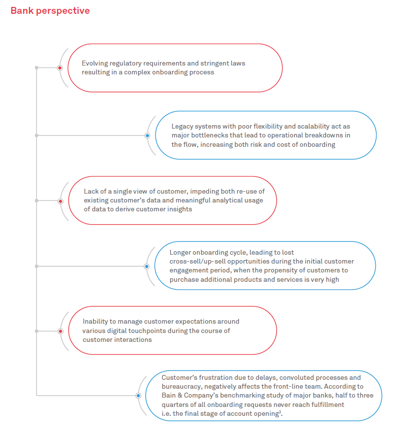 From a business perspective, commercial customer onboarding is highly nuanced and complex. On the one hand, it requires compliance with different regulations and involves lengthy negotiations, stringent documentation, and complex products and services. On the other, it is constrained by the siloed infrastructure of banks. It is, therefore, imperative for banks to streamline onboarding processes to cater to various customer segments and ensure adequate infrastructure support in terms of capacity, costs and operational efficiencies.