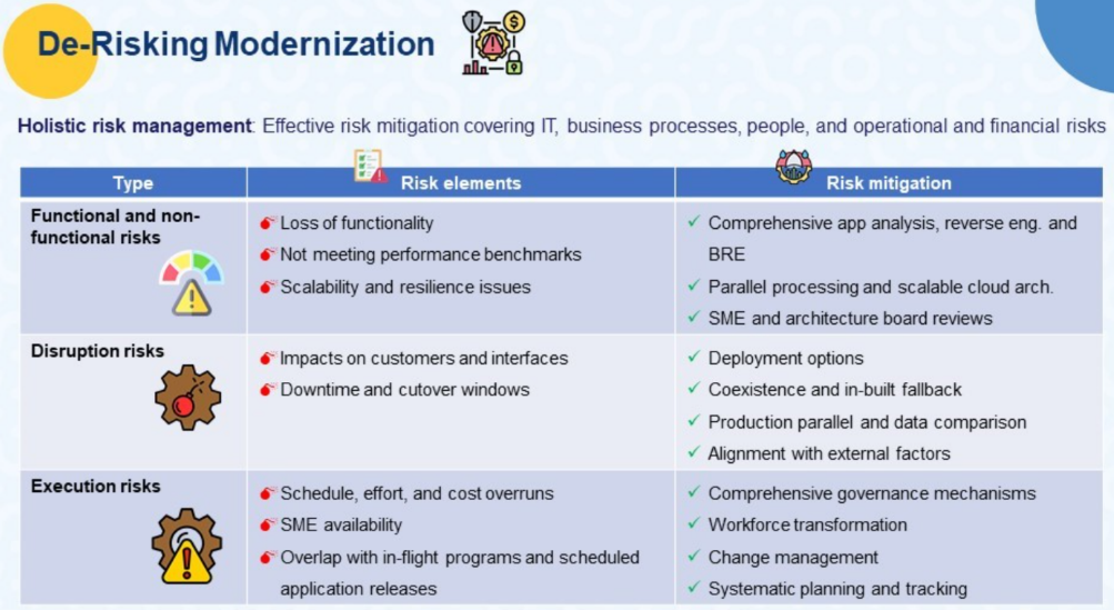 Wipro, having delivered successful large modernization programs, has consistently demonstrated the de-risk approach throughout our end-to-end modernization projects, eliminating an enterprise’s unanticipated risks. Our approach focuses on collaboration with business and IT leadership teams, proactively identifying and addressing the inherent fears or risks to ensure a successful modernization journey.
