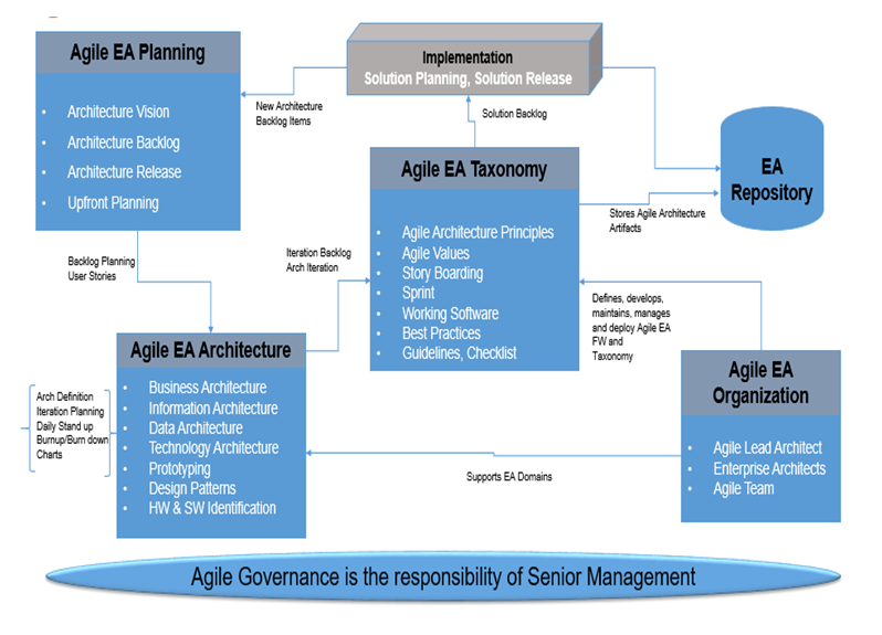 The Agile EA Framework (AEAF) helps in breaking barriers between IT and business, ideally with increasing levels of co-location by unit and with fast forming teams that coalesce for new projects. Minimum Viable Product (MVP) evolves and improves with iteration based on real-time customer feedback. Agile Enterprise Architecture helps in transforming the enterprise to digital by building new architecture that supports Cloud, DevOps, Microservices, Data Analytics, Test Automation and APIs.
