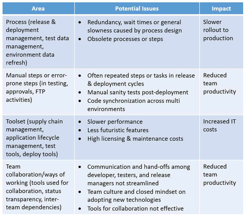 Here’s a good first step toward understanding the scale and size of the problem of rolling out changes to COTS solutions: Analyze the enterprise’s landscape and existing methodology. Wipro’s experience in building solutions for the telecommunications domain has illuminated some of the potential challenges and their impacts, detailed in the chart below. These problems negatively impact productivity and hinder the business goal of faster features rollout.