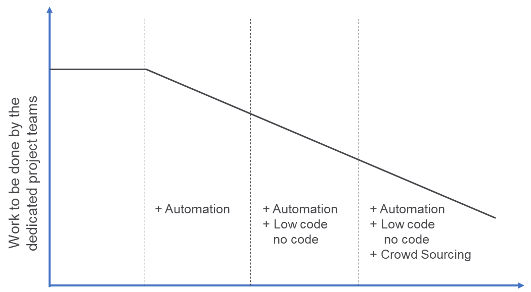 Figure 1: Cut down in the work done by the project team through automation, low code no code and crowd sourcing