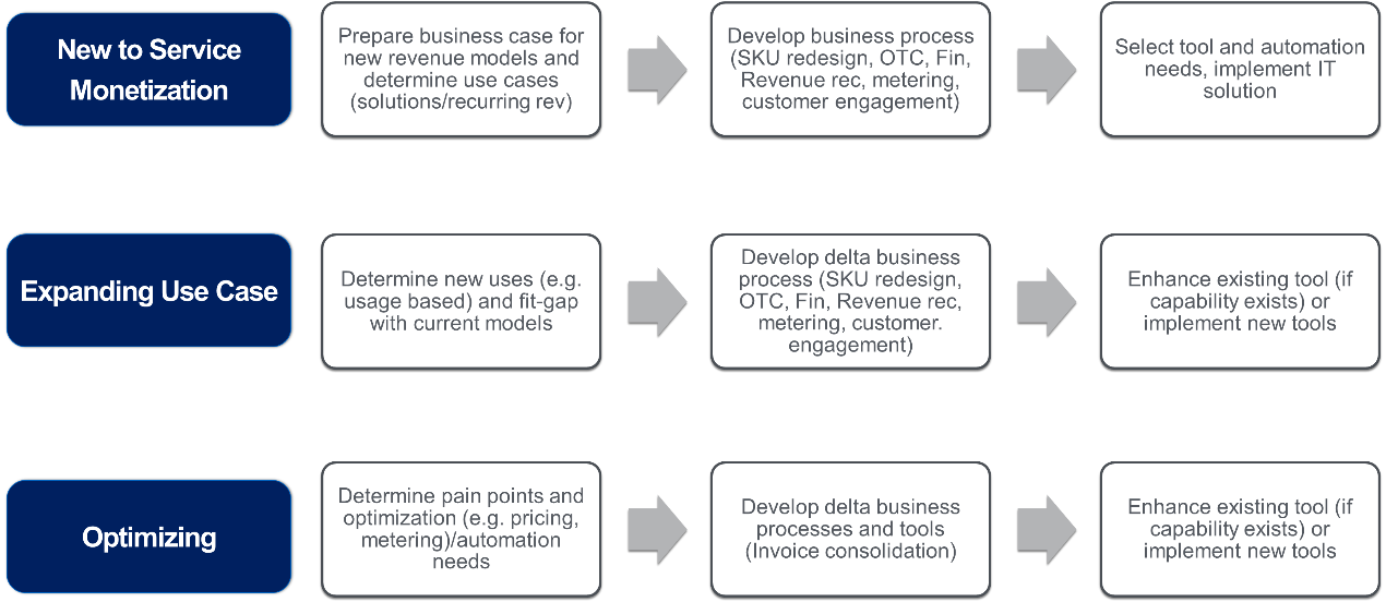 We see three types of service monetization journeys for organizations, depending on where they are in the adaption process. While several companies are already well ahead in their journey to offer their products as services, there are many others who are currently exploring ways to monetize better, and others who have few uses but are thinking of expanding. Each company has a different challenge and approach as they move further on their journey – ranging from defining the use case, to customer adaption, to continually improving the customer lifetime value (See Figure 1).