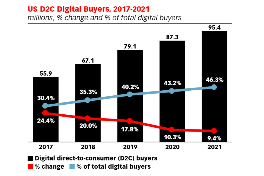 According to eMarketer, the direct-to-consumer ecommerce sales in the US grew by 45.5% in 2020, generating $111.54 billion and making up to 14% of the total retail ecommerce sales. On the other hand, in Europe, McKinsey has indicated that the overall digital adoption jumped from 81% to 95% during the COVID-19 crisis. The D2C model is predicted to further grow aggressively worldwide.