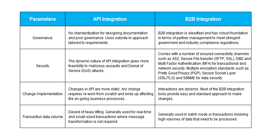 The API integration is enabling seamless business operations between an enterprise and its end partner/s with capabilities promising enough to complement the modern B2B integration landscape. Key Pillars of modern B2B integration include trading partner management, monitoring, and dashboard, deployment and security, multi-network integration and connectivity for trading partners. Though the capabilities of API and B2B integration are seemingly serving the same purpose, there is a stark difference between the two: