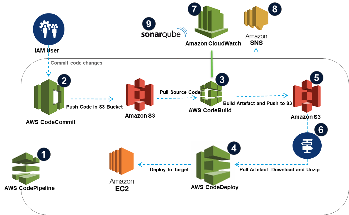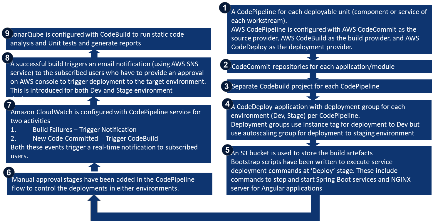 The solution adopted by Wipro Digital engineering team for Swire Shipping Digital DevOps CI/CD pipeline for all tracks is powered by AWS managed DevOps services including CodePipeline, CodeCommit, CodeBuild and CodeDeploy (See Figure 1 for CI/CD model flow and details). The complete stack being on AWS removed the dependency on 3rd party tool integration and was thus easy to configure, setup and run.