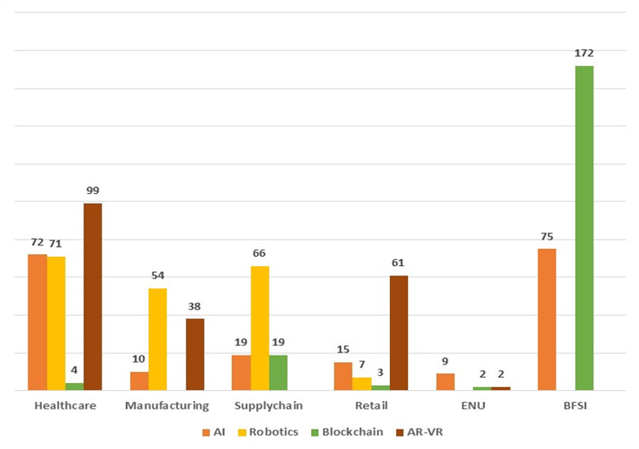 While looking from the digital technology angle, startup concentration appear to be more in AR-VR followed by AI and Robotics for Healthcare; Robotics followed by AR-VR in Manufacturing; Robotics followed by AI and Blockchain in Supply chain; AR-VR followed by AI in Retail; Blockchain followed by AI in BFSI. In the ENU industry domain, more number of startups were found to be working in AI technology space.