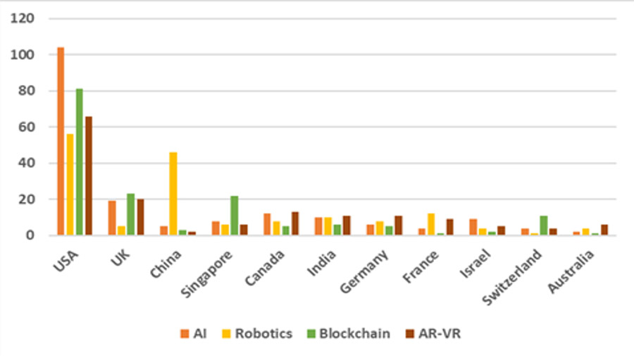 The Information and communication technology space is buzzing with a large number of startups and a significant number of these startups are related to digital technologies. The scope of this analysis has been restricted to startups in digital technologies such as Artificial Intelligence (AI), Blockchain, Robotics and Augmented Reality–Virtual Reality (AR–VR) in selected industry sectors like Healthcare, Manufacturing, Supply Chain, Retail, etc. The analysis considers startups at the cross section of selected industry sectors and key digital technologies, those founded in the last 5 years (2016 onwards). The analysis also tries to highlight startup trends from the point of view of funding, IP ownership (Patents), geographies (headquarter of startup), startup sustenance (age factor), the traction score, etc. The traction score for a startup is indicative of potential of a startup derived from dimensions such as fund raised, growth rate, revenue, employees, etc.