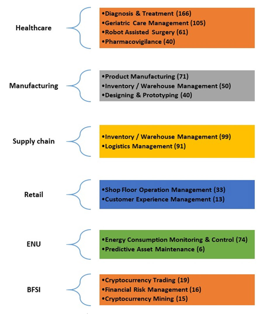 From the analysis, it is evident that Healthcare and Manufacturing industry domains along with AI and Robotics technology have seen more patenting activity. Among the industry domains, patenting activity was predominantly observed in functional areas of Diagnosis & Treatment, Geriatric Care Management in Healthcare; Product Manufacturing followed by Inventory / Warehouse Management in Manufacturing; Inventory / Warehouse Management followed by Logistics Management in Supply Chain; Shop Floor Operations Management in Retail; and Energy Consumption Monitoring & Control in ENU. In the BFSI domain, patenting activity was observed in Cryptocurrency Trading followed by Financial Risk Management and Cryptocurrency Mining.